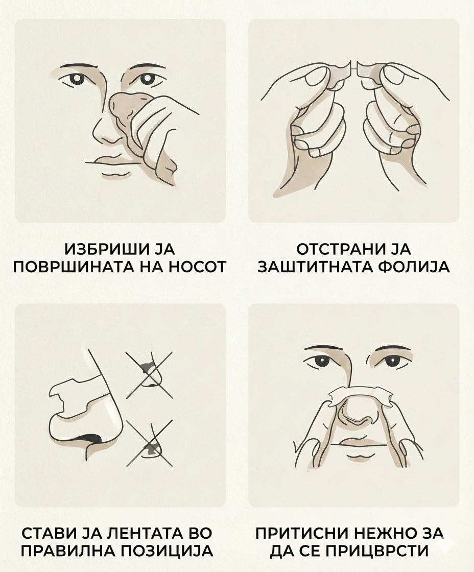 Траките што го подобруваат дишењето на природен и безболен начин, создадени да ви помогнат да дишете подобро секоја ноќ и секој ден. Нашиот производ природно ги отвора носните патишта, овозможувајќи полесно, поквалитетно и подлабоко дишење без напор.
